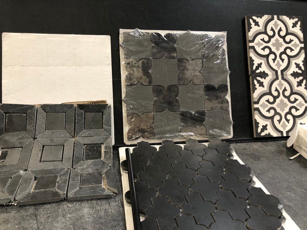 Picking out fireplace hearth tile. Can only describe the far right as “full SoCal goth”