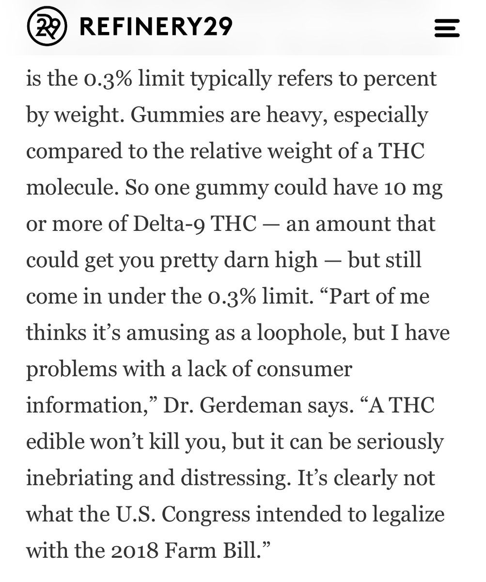 Am I understanding correctly here that the 2018 Farm Bill inadvertently legalized THC edibles nationwide by failing to take into account that percentage-by-weight isn’t a great way to restrict content of a mind-altering substance refinery29.com/en-us/2021/08/10519251/what-is-delta-8-thc-gummies