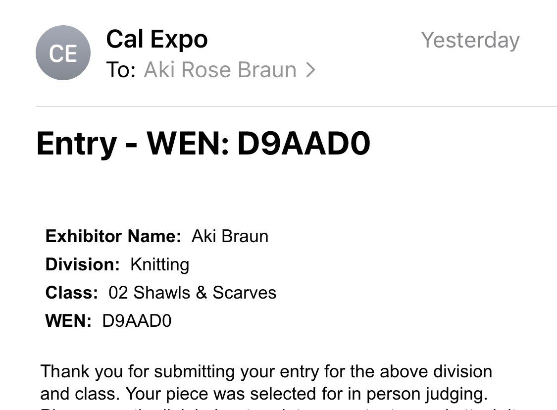 It’s been selected. There will be 8 shawls on display at the California state fair, and one of them will be mine. 🎉