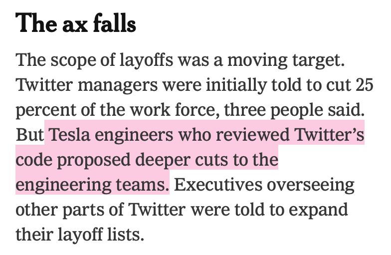 alright i’ve gone from “i’m never going to buy a Tesla” to “i’m never fucking riding in a Tesla ever again”. This is a *terrifying* line from that Times piece that shows total lack of thoroughness & competence, with a sickening dose of Dunning-Krueger. nytimes.com/2022/11/11/technology/elon-musk-twitter-takeover.html